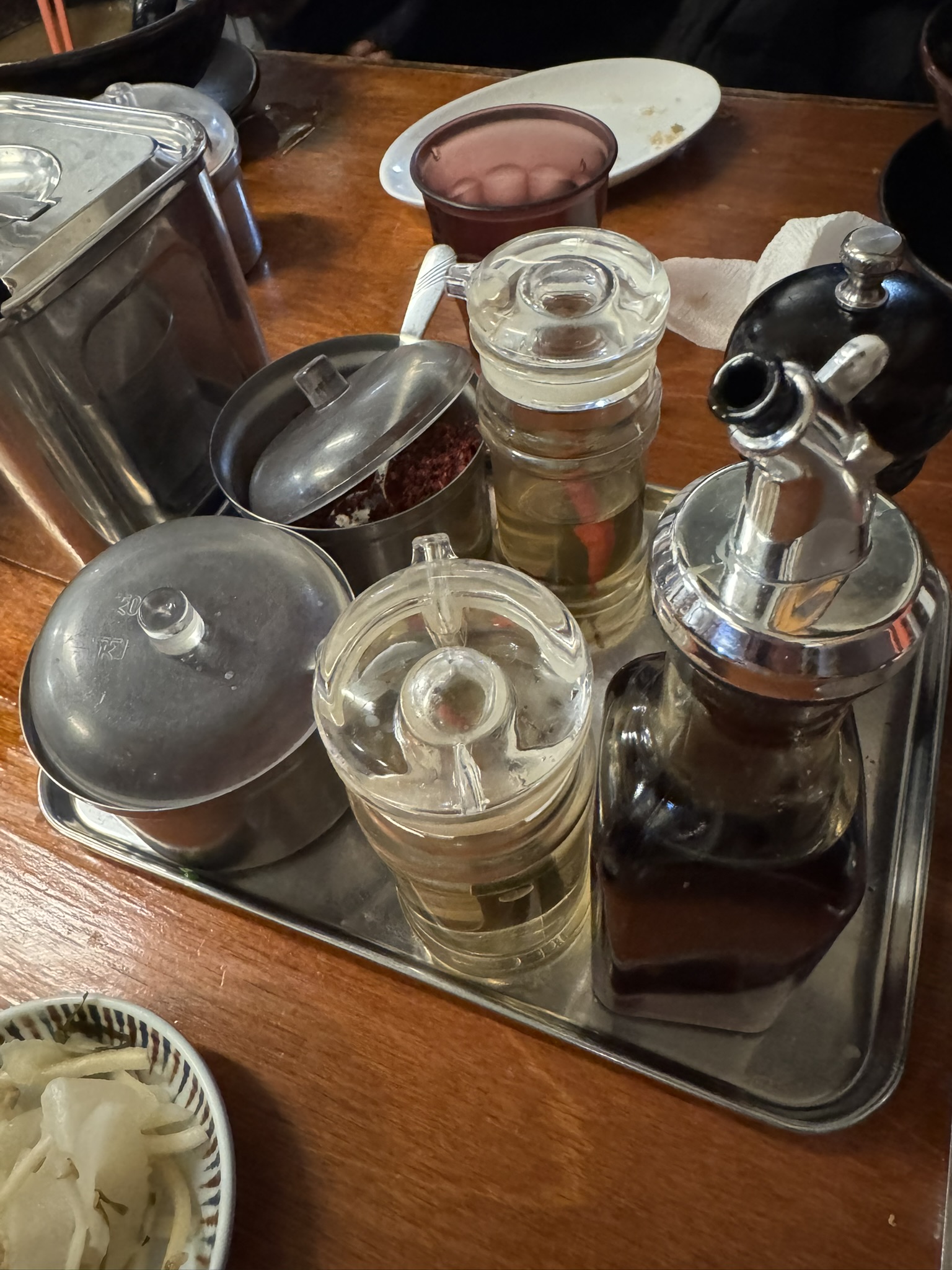 각종 양념들과 차조 같은 단무지와 생강, 다시마로 절인 반찬이 있습니다.