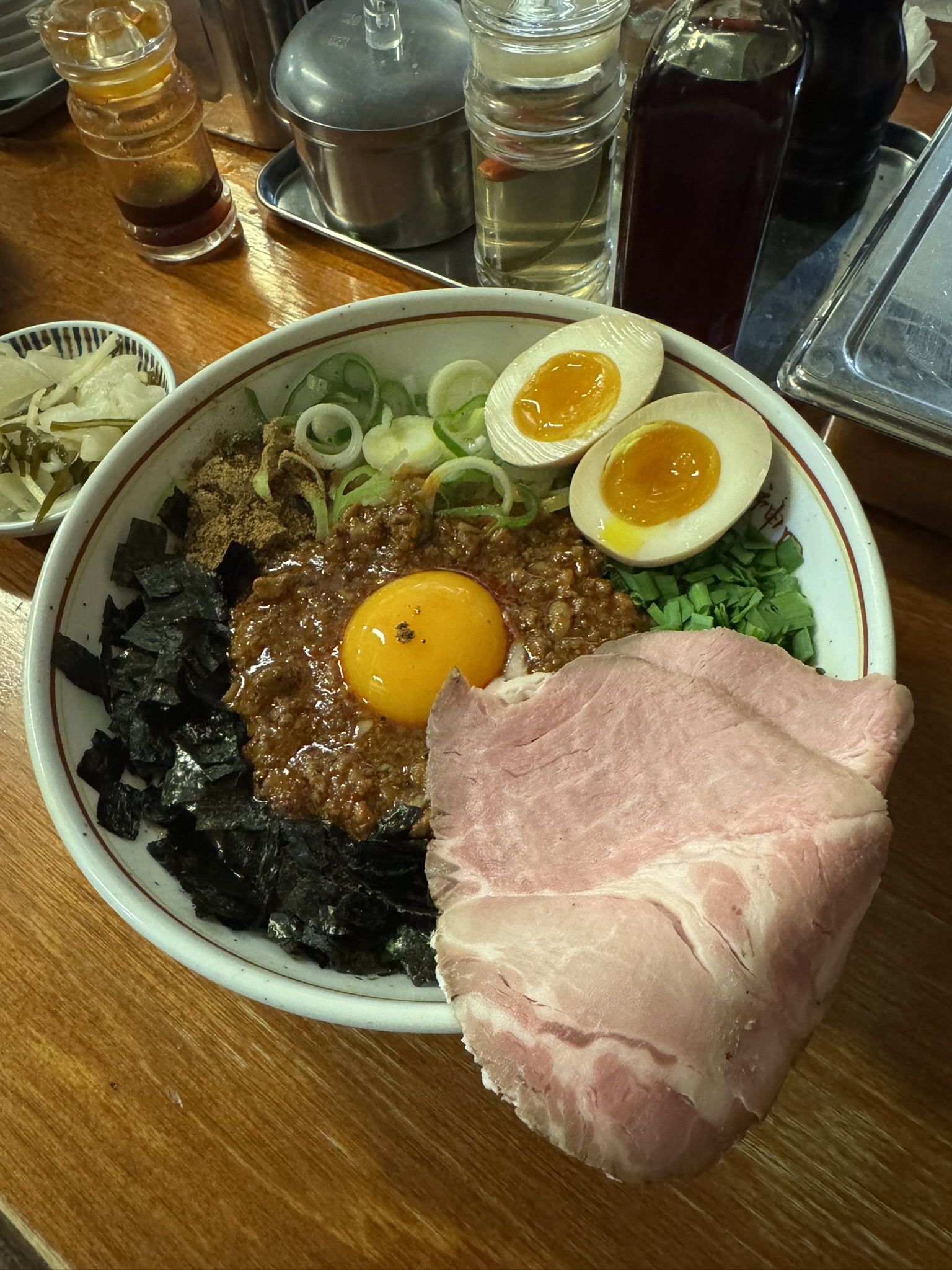 결합한 형태의 라멘으로 진한 수프, 굵은 면, 시금치와 김 토핑이 상징입니다.