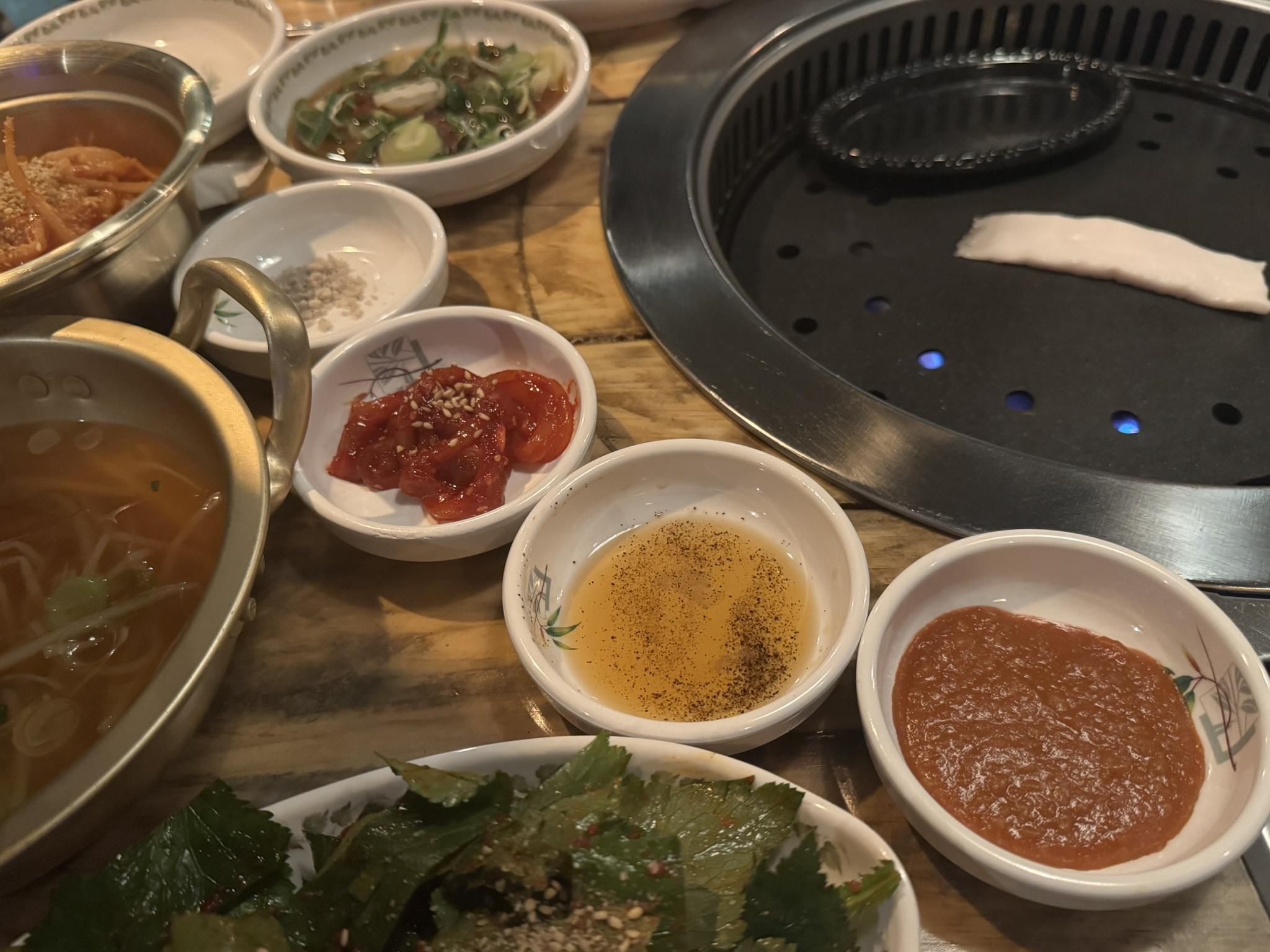 직접 볶아 만든 소금과 오징어젓갈, 기름장, 쌈장입니다.