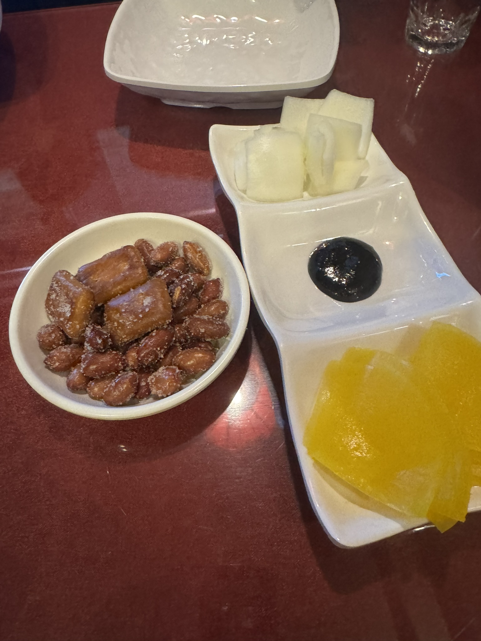 기본찬인 땅콩과 양파, 춘장, 단무지입니다.