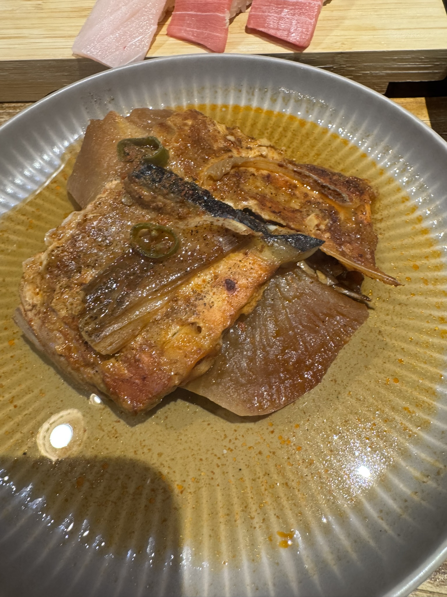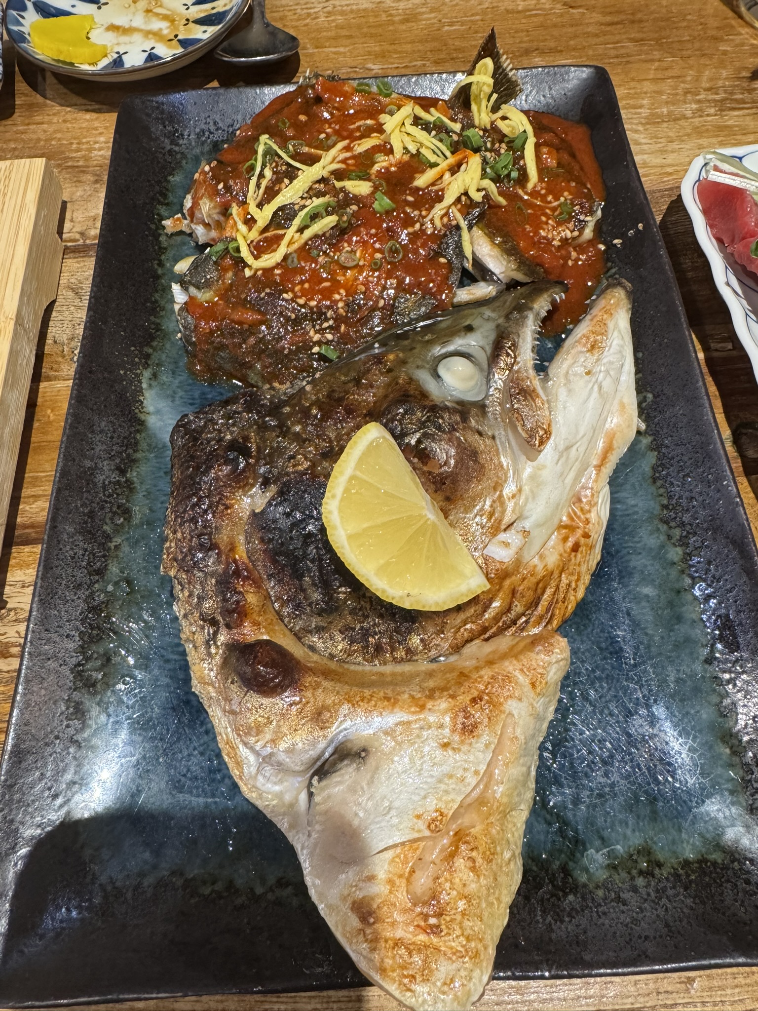 방어 머리 양념 조림과 연어 머리 구이입니다.